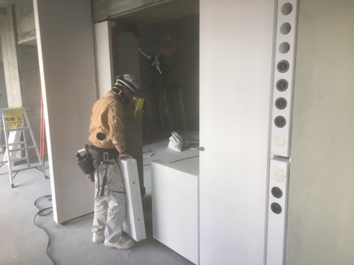 下地アングルの取り付けを行なったALCパネルの建て込みを行ないます。