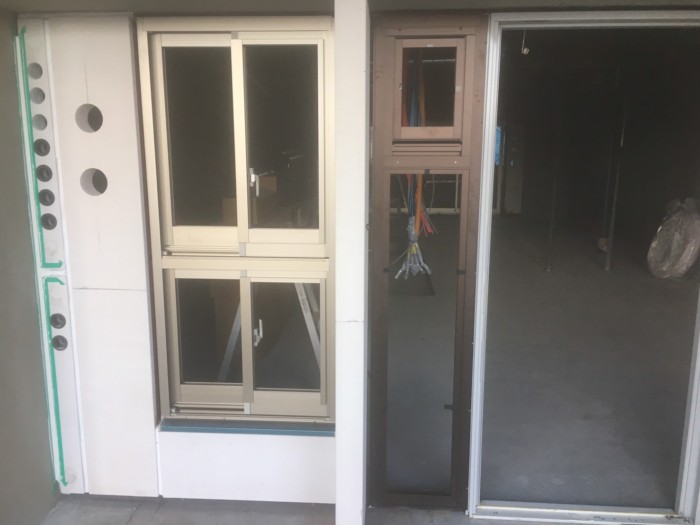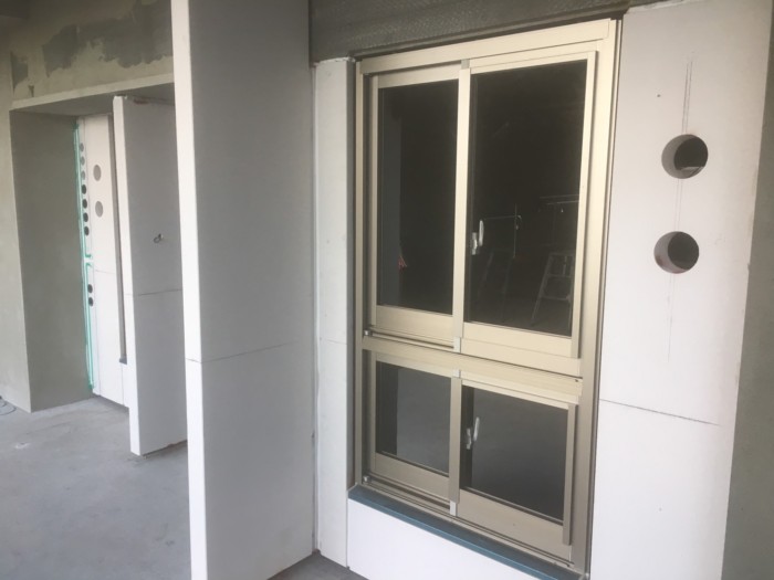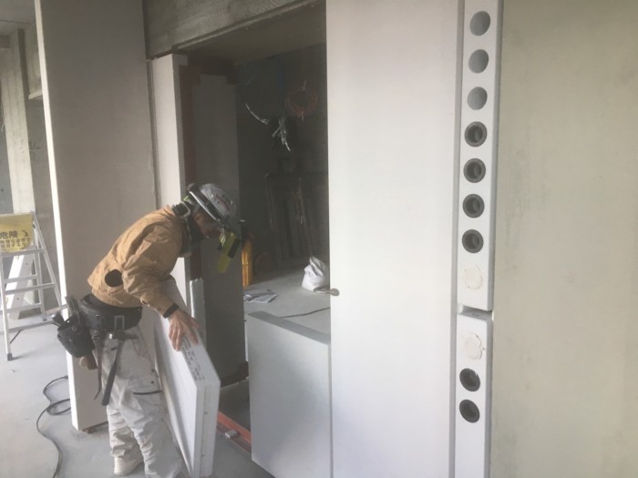 パネルの建て込みが完了しましたら補修を行ないます。欠け補修を行なう際、高い部分のALCパネルの補修が必要な場合には足場を組むことがございます。