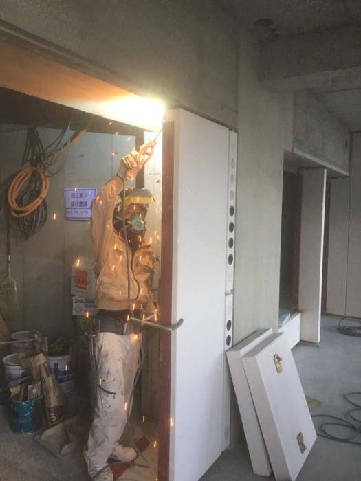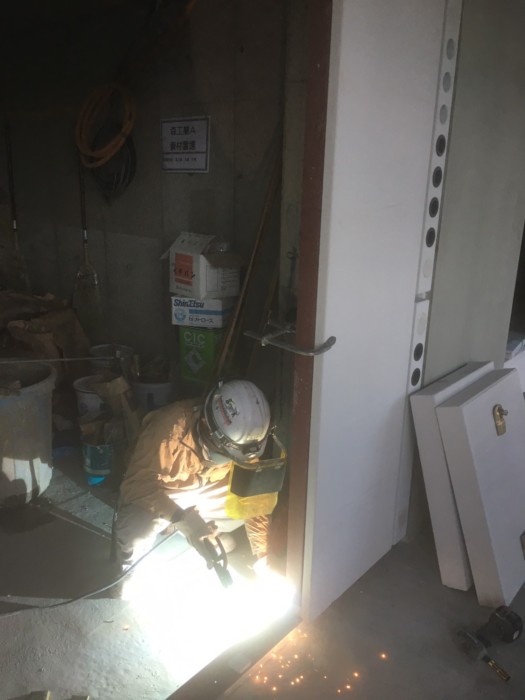 下地アングルを施工図に基づいて取り付けます。この金物を取り付ける際には溶接が必要です。